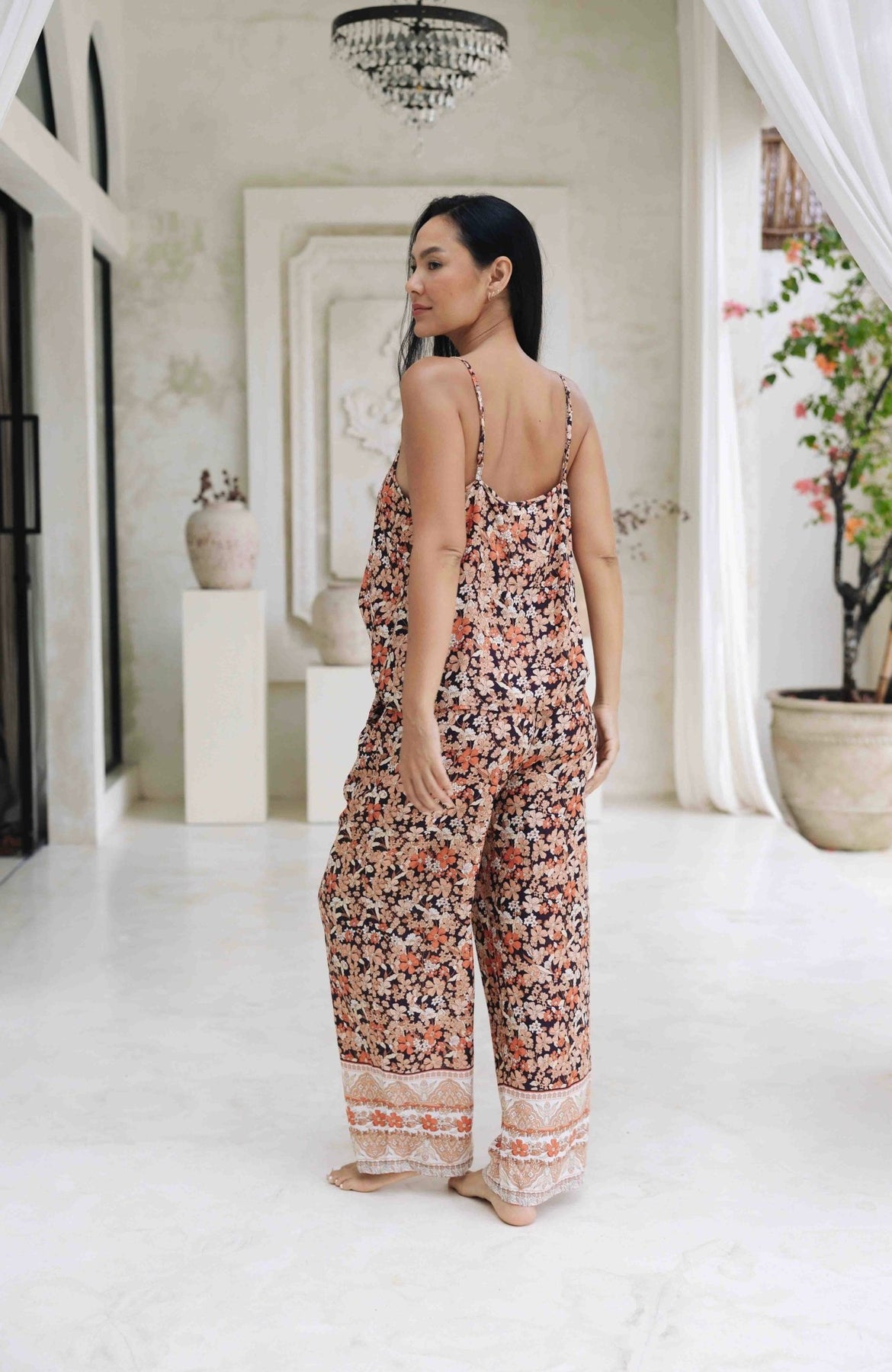The Mika Pyjama Set in Maple is a chic cami and long pants set made from lightweight, breathable fabric that drapes softly against your skin. Featuring a bohemian-inspired floral print on a dark base, with pops of burnt orange, caramel, and shades of ivory and beige.