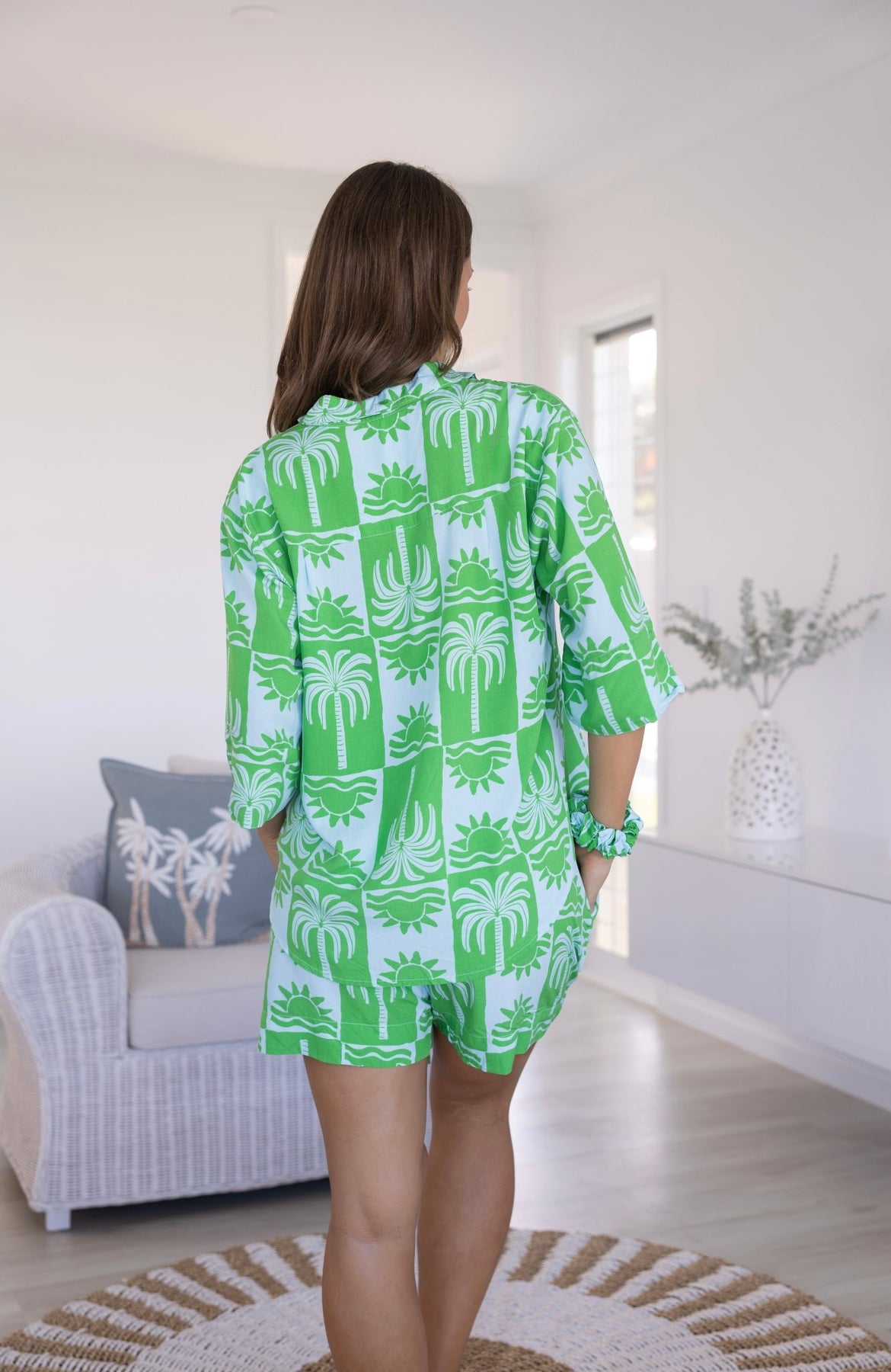Palm green and light blue palm tree print two-piece pyjama set with shirt and shorts, worn as resort wear, video